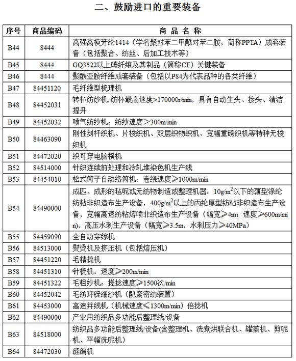 国家发改委、财政部、商务部日前发出通知,发布了《鼓励进口技术和产品目录(2014年版)》。其中包括喷气纺纱机:纺纱速度>300m/min;转杯纺纱机:纺杯高速度>170000r/min,具有自动生头、接头、清洁提升;松式筒子自动络筒机;高速并线机(机械速度≤1300m/min)倍捻机等设备。