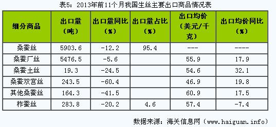 (六)桑蚕丝为我国生丝出口主要品种。2013年前11个月,我国出口桑蚕丝5903.6吨,下降12.2%,占同期我国生丝出口总量的95.4%;出口柞蚕丝283.8吨,下降20.2%,占4.6%。此外,不同生丝产品在出口均价上也存在明显差异。