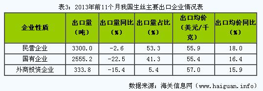 (四)民营企业出口占据我国生丝出口半壁江山,国有企业出口大幅下降。2013年前11个月我国民营企业出口生丝3300吨,下降2.6%,占同期我国生丝出口总量的53.3%;国有企业出口2555.2吨,下降22.5%,占41.3%。