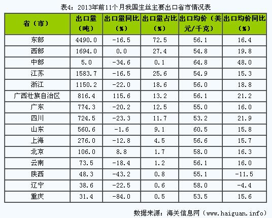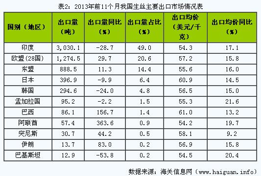 生丝是桑蚕茧经过缫丝后得到的产品,我国生产生丝有着悠久的历史,现代的产量居世界首位,同时出口量也居于世界首位。相关统计数据显示,中国生丝年产量在2万吨以上,出口量更是占世界生丝贸易总量的80%以上。据海关信息网统计,2013年前11个月我国出口生丝6189吨,比去年同期(下同)下降12.5%;价值3.5亿美元,增长2.5%;出口平均价格为每千克55.7美元,上涨17.2%。今年前11个月我国生丝出口呈现以下特点: