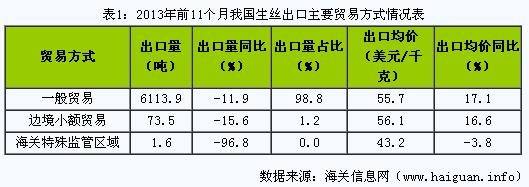 (二)一般贸易方式绝对主导出口。2013年前11个月,我国以一般贸易方式出口生丝6113.9吨,下降11.9%,占同期我国生丝出口总量的98.8%;以边境小额贸易方式出口生丝73.5万吨,下降15.6%,占1.2%。