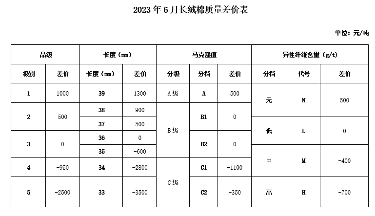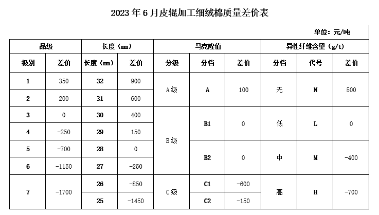 根据《中国棉花协会国产棉质量差价表管理办法》规定,现正式发布2023年6月《锯齿加工细绒棉质量差价表》、《皮辊加工细绒棉质量差价表》和《长绒棉质量差价表》(单位:元/吨)。
