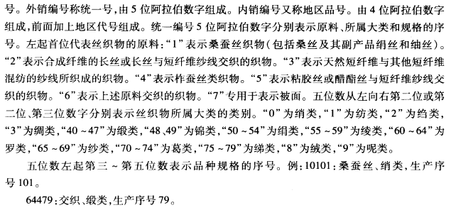 为了便于生产、销售和进行技术交流,丝织物按其组织结构、加工工艺、使用原料及外观形态和用途等特点,给予每一个品种以恰当的命名,并根据分类状况编排一个代号。