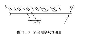 (6)对原已使用过的老剑带上更换新剑头时,必须注意检查剑带磨损情况,按主机厂要求进行更换。例如SM93织机规定剑带宽度已减小0.5mm、厚度减小0.5mm,二齿孔间宽度减小2mm时,必须要进行更换新剑带后才能再更换新剑头。例如FAST织机(图13-3)规定剑带大磨损处厚度H不能薄于1.0mm,剑带孔长度F不得超过5.25mm。
