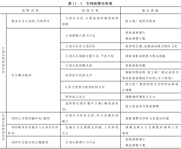 织造过程中,常出现左右剑头交接失误等纬向故障,原因多种多样,有的是调整问题,有的是剑头本身问题,现将综合情况见表13-3。