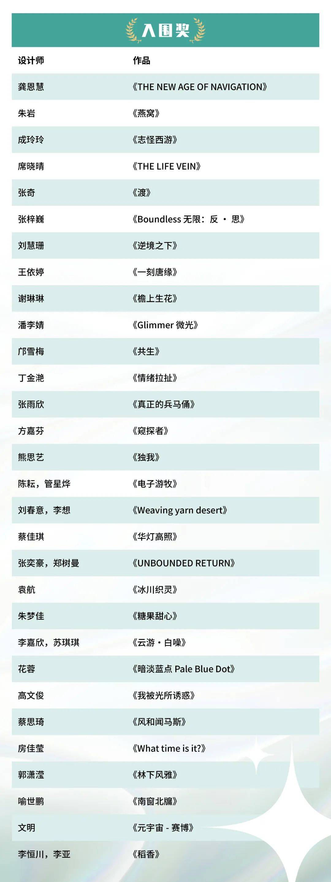 方奕和沙莎的《浮生》,曹璇的《沙曲》,任骏娇的《漠“丘”之曙》,陈佳莹和兰青的《枯·生》,蒋珊珊的《文人墨客》,郭琦和李奇帅的《层峦》,章益裕和龚艳萍的《影》,王充的《独白》,李鸿燕的《维度时空》取得优秀奖。