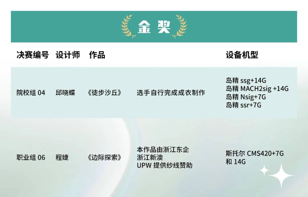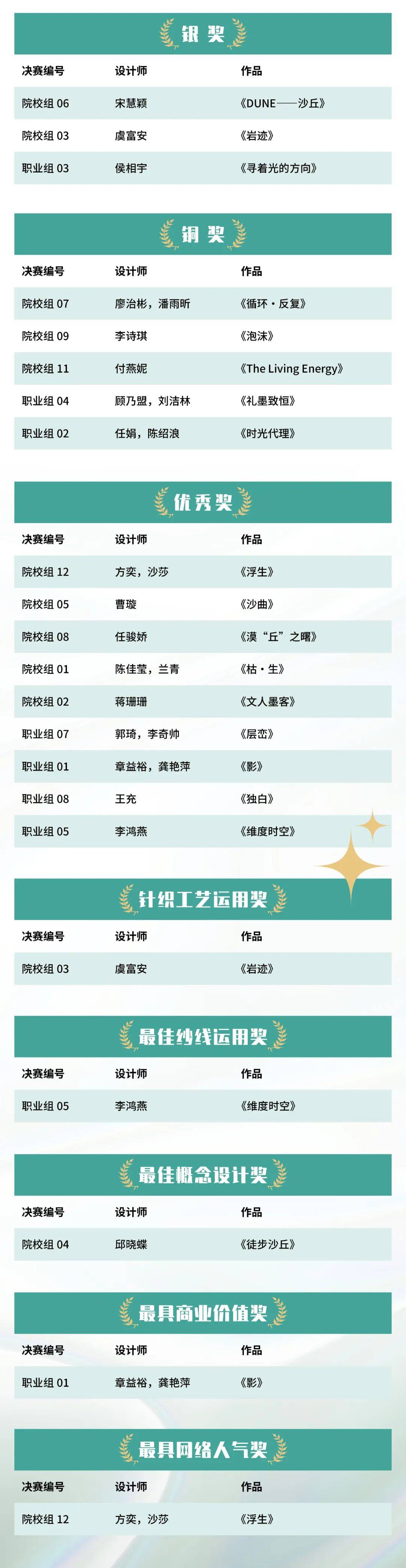 此外,本届大赛还特别设立了针织工艺运用奖、佳纱线运用奖、佳概念设计奖、具商业价值奖和具网络人气奖,以奖励在工艺、原料、创意、市场化等方面有突出表现的设计作品。(完整获奖名单见文末)