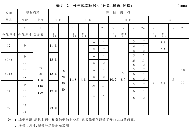(5)综框的横梁需平直和坚固,抗拉强度σb≥240MPa。横梁的截面尺寸根据织机、织物等参数选用,确保其有足够的强度。常用截面有连体横梁、分体横梁,主要尺寸见表5-1、表5-2。