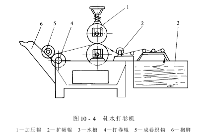 ②轧水打卷:轧水打卷机由水槽、扩幅辊、轧水辊和传动装置等组成,见图10-4。轧水是在平幅轧水机上进行的。操作时两辊自然接触,织物需预先缝接好,依次无压地浸在清水池内,然后平整无皱地通过轧点被卷在卷布轴上,桑蚕丝薄织物一般不加压水辊,防止坯绸产生松紧,经轧水机后造成压刹印疵病。所以,轧水工艺实为打卷。较厚的织物等可加压水辊,一般用于纺类、斜纹类、缎类织物。它可以防止皱印,但容易产生卷边和皱条等疵病。