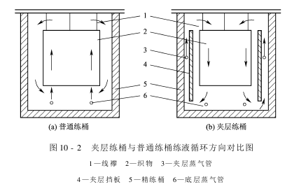 ②夹层练桶:当练桶底部的蒸汽管加热时,练液上升,使织物浮起,产生擦伤和折皱印,且练桶上下存在温差,可以采用夹层练桶。夹层练桶是在普通练桶的两边距桶壁4~5cm处,加装一块约2mm的不锈钢挡板。挡板下沿距桶底约20~30cm,使与桶壁间形成夹层。挡板上沿浸没在液面之下,略高于织物上沿。在每边挡板与桶壁的适当位置安放一根直接蒸汽管。织物精练时,关闭底汽,仅用夹层蒸汽保温。由于夹层蒸汽管的蒸汽喷出口都向上,蒸汽喷出时,驱使练液由底部涌入夹层,从夹层的上口溢出,流向练桶中央,形成自上而下的流向。这同原来使用底层蒸汽管时的自下而上的练液流向恰好相反。但夹层练桶使用不当时,也可能使液流出现“短路”,即液流不从每匹织物页间穿过,而从匹与匹间流过,并使织物各页闭合,反而影响精练均匀程度。