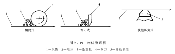 泡沫涂敷机是把泡沫状的整理剂连续均匀地施加到织物上的专用设备。其形式较多,归纳起来可分为辊筒式涂敷机、狭缝压力式涂敷机和刮刀式涂敷机三类,如图9-19所示。
