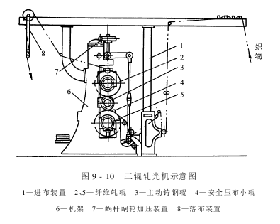 普通轧光机适用于织物的一般轧光整理,用于各类漂、色、花平纹织物的平轧光,在加重压力的条件下,也可作为硬浆薄织物的重轧光整理用设备。图9-10为普通三辊轧光机示意图。
