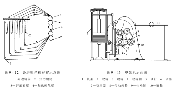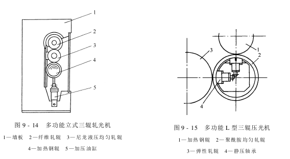(1)普通轧光机:普通轧光机一般由三个轧辊组成。辊筒排列形成有“软—硬—软”或“硬—软—硬”两种。这种设备采用蒸汽加热,加热辊的温度为80~220℃。