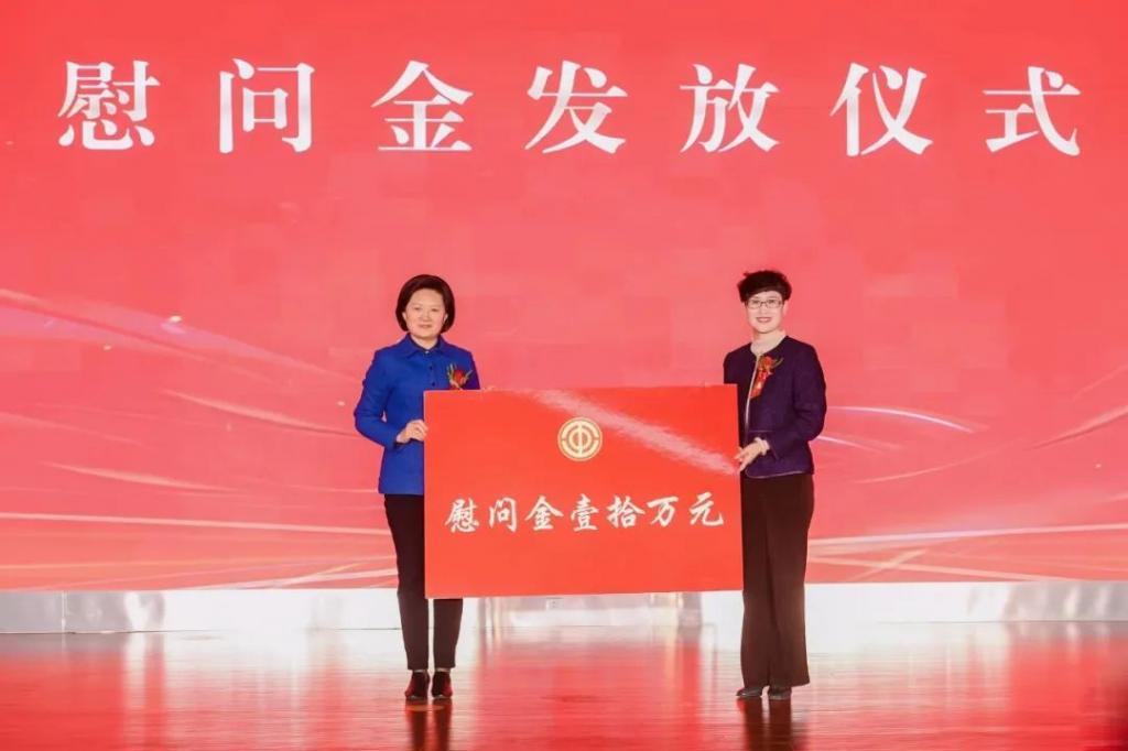 中国财贸轻纺烟草工会主席王倩向职工代表发放慰问金