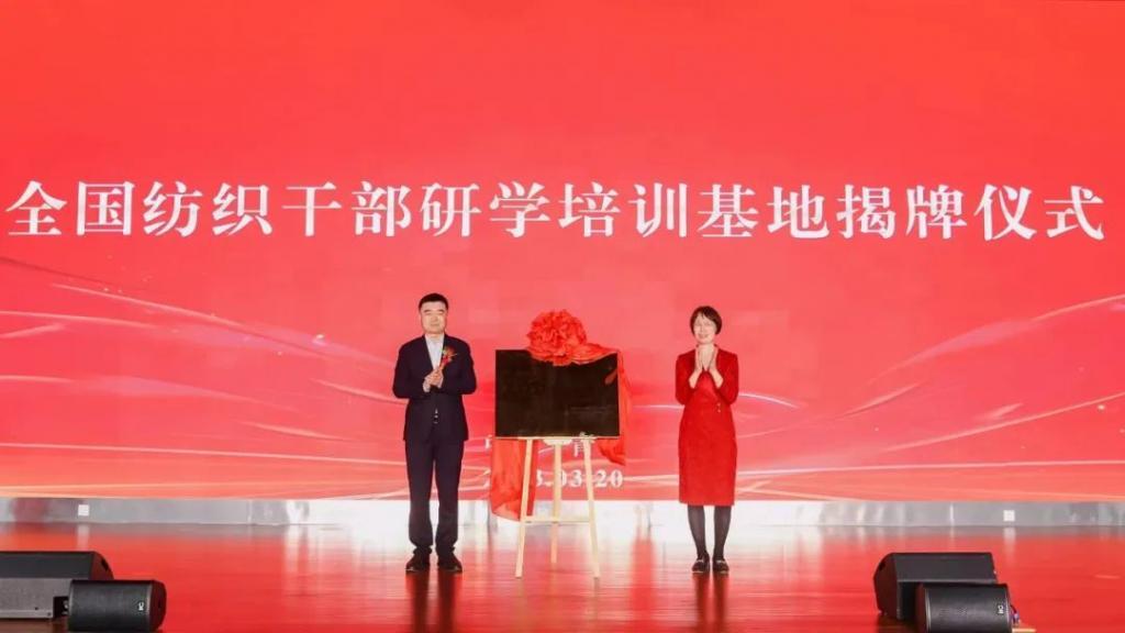 中国纺织职工思想政治工作研究会会长邢冠蕾和青岛市市北区委副书记、区长刘新学共同为“全国纺织干部研学培训基地”揭牌。纺织谷成为行业首家“国字头”纺织干部研学培训基地。