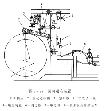 进布装置由进布辊、紧布架、吸尘器、松紧补偿器、吸边器和弧形电热板等组成,如图8-28所示,适用于布箱进布和布卷进布两种方式。在进布处另安装有光电布边探触器,它的灵敏度高,能有效地控制进布位置,使印花时布幅两边保持整齐的白边。对一些容易引起卷边的织物,可加装三辊螺旋剥边器,使布边平服地进入弧形电热板后,经压布辊平整地黏着于涂热塑性树脂的印花导带上。