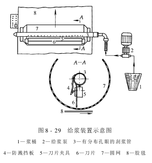 给浆装置主要由浆桶、给浆泵、刮浆管、刮刀、刮刀夹具等组成,如图8-29所示。刮刀管装在圆网里面,一端用管顶帽封闭,防止色浆流溢,一端装管接头,通过塑料软管与给浆泵相连。
