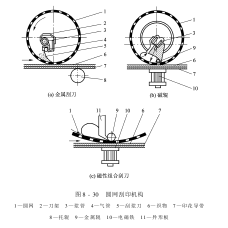 ①弹性金属刮刀刮印装置:该装置由刮刀架、刮浆刀和给浆管等组成,如图8-30(a)所示。色浆由给浆装置送到刮浆刀与圆网之间的楔形槽中,刮浆刀靠气管沿幅向均匀夹持,在机械力作用下产生弹性变形。当圆网转动时,色浆在楔形槽中受刮浆刀挤压而均匀地充满圆网孔眼并被挤向织物。