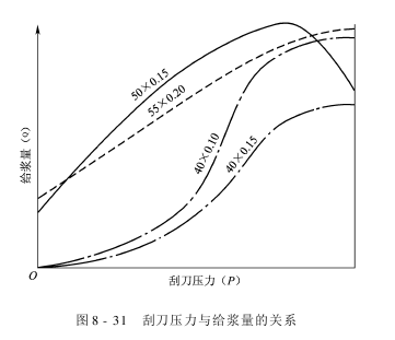 给浆量随刮刀施加的压力不同而不同,如图8-31所示。可以看出,给浆量Q随着刮刀所施加的压力增加而递增,但当刮刀压力P增加到一定数值时,Q的递增趋于缓慢。而刚性较强的刮刀(如50mm×0.15mm规格的刮刀),当P值达到某一极限值时,若再增加压力,Q值反而趋于下降。这说明要获得高的给浆量,不能单纯靠增加刮刀压力,而首先应该选择适当型号的刮刀,然后通过微调来获得佳的压力状态。若盲目增加刮刀压力,不但达不到预期效果,而且导致刮刀与圆网之间摩擦力增大,造成圆网损坏。