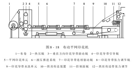 导带行进→带静止→色框下降→刮印器刮印→色框提升→导带行进→……布动平网印花机一般与其他单元机和通用装置组成印花联合机,由进布装置、印花单元、烘燥和出布装置等组成,如图8-18所示。印花单元是布动平网印花机的核心部分,主要由贴布装置、导布机构、色框升降机构、刮浆机构、清洗机构等组成。