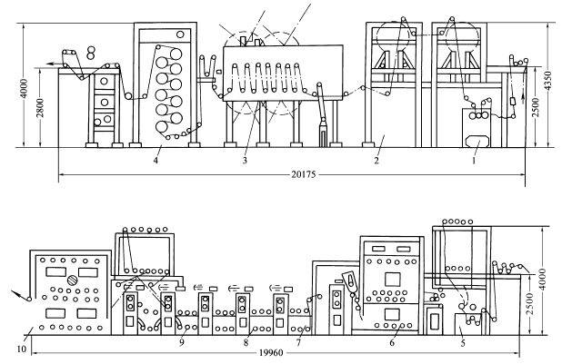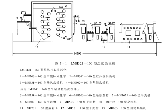 连续轧染机是能适应多种染料不同工艺要求连续轧染的一类平幅染色联合机。这类设备适用性强,可一机多用,生产效率高,产品质量好,操作维修较方便,是较为理想的染色设备。这种设备的种类较多,组成各有差异,但其主要组成单元机不外乎以下几种:平幅进布装置、平幅浸轧机、红外线烘燥机、热风烘燥机、汽蒸箱、焙烘机、平幅水洗机和烘筒烘燥机等。在选择时,可根据不同的工艺要求,设计出不同组合的轧染联合机。图7-1所示LMH321—160型连续染色机就是其中的一种。此机可供棉及棉型织物等进行活性染料、还原染料、不溶性偶氮染料等的连续轧染,也可进行一般不需汽蒸的可溶性还原染料的连续轧染。
