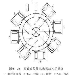 在5中轧液部分处设有一根轧液辊,以轧去多余的碱液。6、7、8为水洗部分,各设有喷水管、轧辊和盛水盘。盛碱盘能自动升降,盛水盘和残碱贮槽相通。轧辊由硬橡胶制成,由油泵施压,能自由升降。整个回转装置,套纱辊间的距离,转向的交替更换,碱盘的升降,轧辊的升降,喷水管的启闭,都能自动控制。