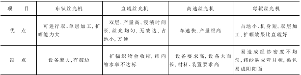 此外,还有高速直辊丝光机及布铗—直辊联合丝光机,这里不再介绍。常用的几种丝光机丝光效果的比较见表6-2。