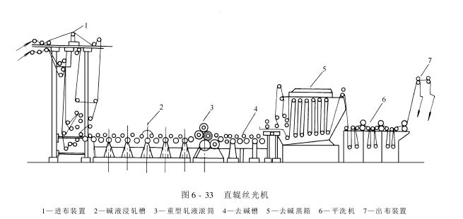 直辊丝光机由进布装置、碱液直辊浸渍槽、轧液装置、冲洗去碱槽、去碱蒸箱、平洗机、烘燥机及出布装置组成,如图6-33所示。