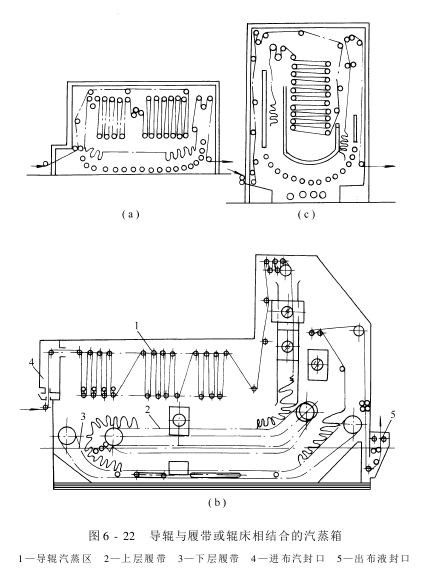 图6-24所示为唇封式高温高压汽蒸箱。织物经唇封口进入卧式圆筒形汽蒸箱后,堆置在主动回转的不锈钢辊组成的辊床(伞柄)上,在高压(196kPa)蒸汽中汽蒸1~4min,导出洗净。它的唇封口结构见图6-25,进机织物和出机织物分别从固定安装的中心支架的两个光滑表面滑过,管形气袋内充入压缩空气后,通过外包聚四氟乙烯唇板,将织物压向中心支架表面,形成密封。