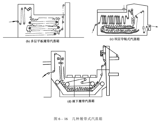 履带式汽蒸练漂机结构简单,操作方便。由于堆积布层较薄,皱痕情况较前两类设备大为改善,且汽蒸效果较好,张力和摩擦都较小,目前为印染厂广泛使用。导辊式汽蒸箱适宜多层堆置,因为翻转织物处的导辊可按需要排列和设计成不同转速。导辊缓缓回转,可克服履带上织物与板面接触处容易产生的汽蒸不匀和干斑痕迹,不易擦伤织物,但导辊安装、维修和制造要求高,设备价格高。