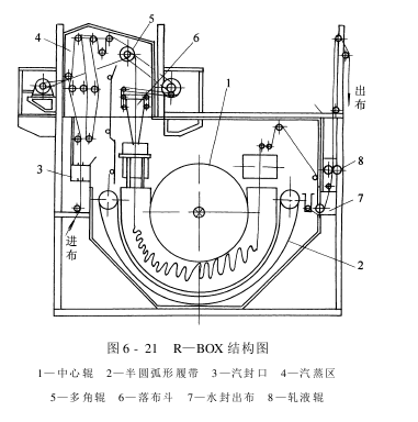 该机由汽封进布装置、汽蒸箱、折叠堆布装置、输送机构、水封出布装置、轧液辊、加热保温和传动机构等部分组成,如图6-21所示。输送织物的机构由主动回转的中心辊和主动运行的半圆弧形履带组成。左右两侧有幅宽调节板,可根据平幅织物幅度要求手动调节。平幅织物浸渍处理液后经汽封口进机,先在上下导布辊间汽蒸加热,再经多角辊、落布斗折叠落堆于缓慢运行的半圆弧形输送履带上。有时履带下部浸在处理液中,并有直接和间接蒸汽加热管使处理液加热和保温。如果煮练即可煮沸,它比只经汽蒸的织物效果佳。织物在处理液中由中心辊和弧形履带输送,张力很小,可供对张力敏感的机织物、针织物退、煮、漂,不易产生折痕。该机也可仅作汽蒸而不经液煮,视工艺要求而定。汽蒸温度为97~100℃,液煮为95~98℃,容布量有2000m、4000m、6000m、8000m等多种规格,布速为35~100m/min。
