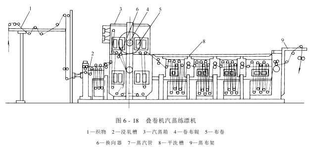 叠卷式汽蒸练漂机既具有轧卷式汽蒸机的特点,又实现了连续化生产,提高了生产效率,可用于轧碱汽蒸煮练、过氧化氢和亚氯酸钠的汽蒸漂白以及次氯酸钠的漂白,如图6-18所示。