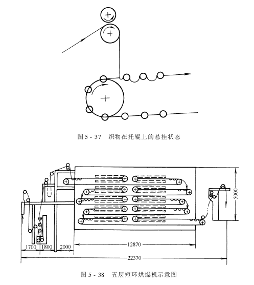 如图5-36所示。烘燥时布环较短,实际上织物是由导辊循环链上缓缓自转的导辊托着运行的。在两辊之间,织物稍呈悬挂状(图5-37)。因此,常把导辊称作托辊。热空气从织物上下的风嘴喷向织物两面,风速分别约为13m/s和7m/s,使织物短环不被吹乱。这种短环热风烘燥机除单层结构外,还有双层至五层的多层结构,如图5-38所示。这种烘燥机结构更紧凑,占地也少。但因烘房较高,操作检修不方便。