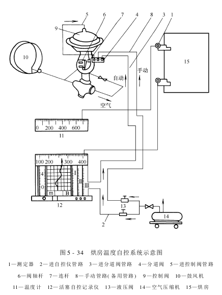 烘燥机的自动控制系统有空气自动控制、煤气自动调节和烘房温度自动控制等。图5-34为烘房温度自控系统示意图。烘房温度可在活塞式自控记录仪调节到所需要的范围。当烘房内的温度超过或低于规定温度时,自动调节系统便能自动调节温差,借助烘房内的温差来控制空气量的大小和燃气量的大小。