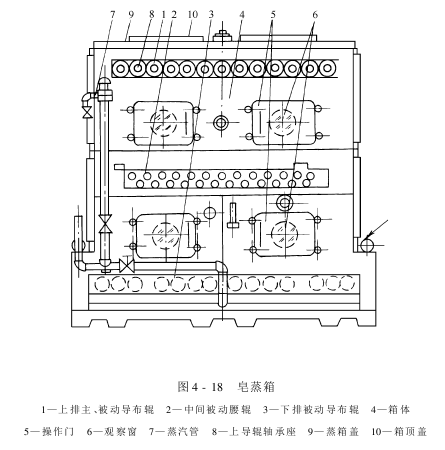图4-18所示为皂蒸箱,供棉、涤/棉及一般化纤混纺织物染色及印花后皂煮和热水蒸洗用。箱内安装三排导布辊;上排13根,奇数为主动辊;中间26根小直径腰辊和下排14根导辊均为被动辊。蒸箱铸铁箱体的前后板均为铸铁制蒸汽夹板,用来间接加热,保持箱内温度。箱内底部装8只外套消声筒的直接蒸汽加热管,用来加热洗液。汽域部分装4只直接蒸汽喷管,进行喷汽汽蒸。