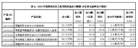 从化纤及工业用纺织品出口的主要品种来看,聚酯类品种出口额居前,出口额在10亿美元以上的品种总共有5种,出口额合计占同期化纤及工业用纺织品出口总额的27.8%(详见表4)。