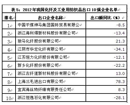 从出口企业情况来看,我国化纤及工业用纺织品出口集中度较低,出口额排名前10位企业出口额合计仅占同期出口总额的4.3%(详见表5)。