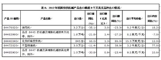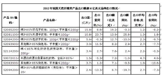 由于2012年国内原材料价格和劳动力成本不断攀升,导致我国纺织出口企业的竞争力严重下降。据新数据统计显示,2012年全年我国仅纺织原料及制品、服装及饰品类产品出口呈现增长;天然纤维类产品、化纤及工业用纺织品类产品、纺织机械产品均呈现下降趋势。