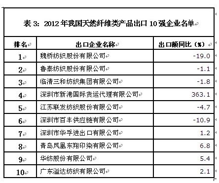 从出口企业情况来看,我国天然纤维类产品出口集中度较低,出口额排名前10位企业出口额合计仅占同期出口总额的10.9%。(详见表3)。