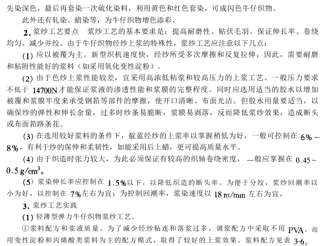 该工艺流程由于在分经到浆纱的过程中,对染色的经纱作两次排列,而掩盖了染色过程中所造成的区域性色差,使成品颜色均匀柔和,做成服装经石磨加工后,不会产生色条,质量好。但工序多,投资、占地面积、用工等均较大。