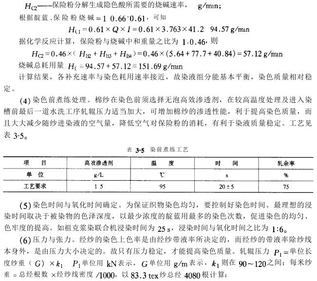 该工艺流程由于在染色过程中,停车次数较多,又没有经纱的两次排列,故色泽均匀度较难控制,且效率低、靛蓝染料的消耗大。但具有工序少、对经纱损伤小、投资小、用工省、见效快的特点。我国生产牛仔织物大多采用片状染色的工艺流程。