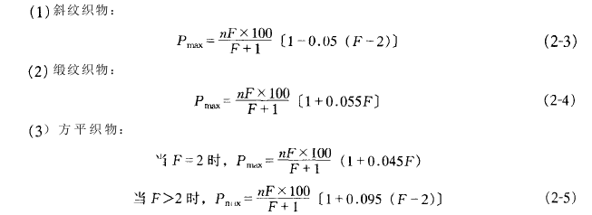 该计算方法的缺点是没有考虑到整个织物的组织情况,即当织物的组织点平均浮长F相同,而织物组织不同时,该方法不能区别对待。如果将织物组织变化的因素考虑进去,可将上式修正得到以下各式。