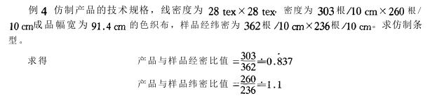 ②分别求出样品的经密和产品经密(成品经密)的比值、样品的纬密和产品纬密的比值。