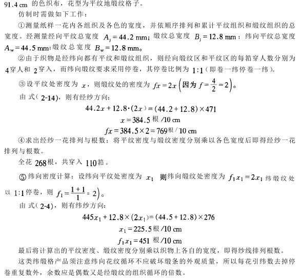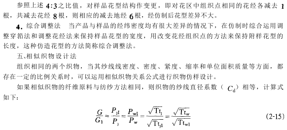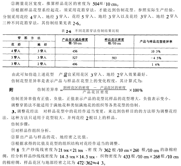采用这种仿制方法测量要精确,否则就会影响仿样效果,同时在修正经、纬纱排列根数时,同样要考虑到产品格型的方正要求。