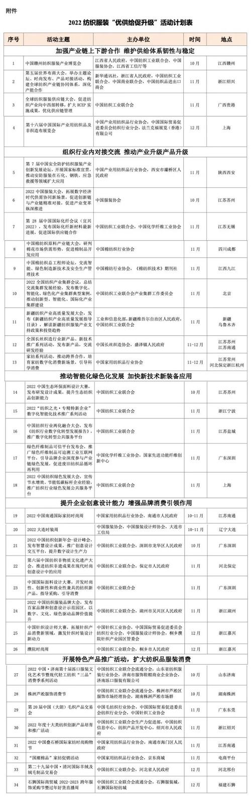 (一)加强组织协调。中国纺织工业联合会按照《2022纺织服装“优供给促升级”活动计划表》(见附件)安排,精心策划方案,抓好任务落实。各地工业和信息化主管部门结合本地实际和发展需要,与有关行业协会和地方加强对接,组织调配资源,形成合力统筹推动各项活动务实见效。