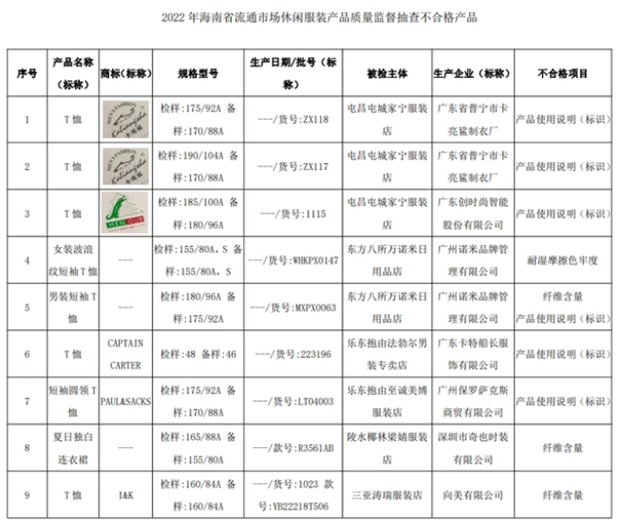 2022年10月9日,海南省市场监管局网站公布2022年海南省流通市场休闲服装产品质量监督抽查结果。