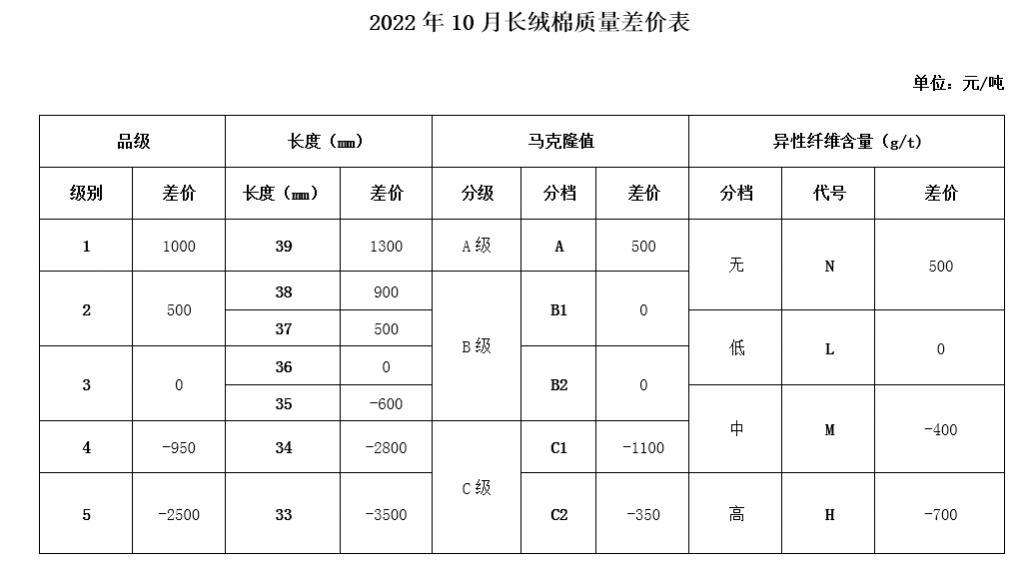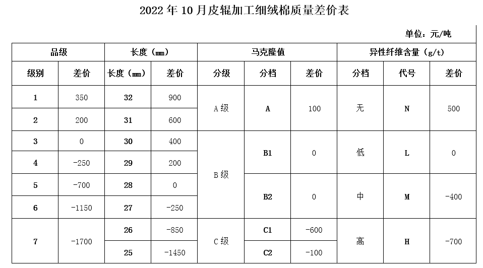 2022年10月中棉协《国产棉质量差价表》