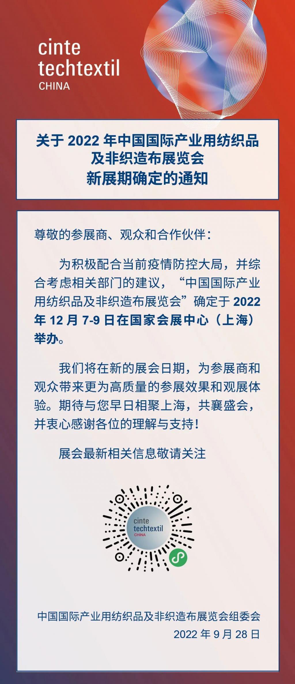关于2022年中国国际产业用纺织品及非织造布展览会新展期确定的通知