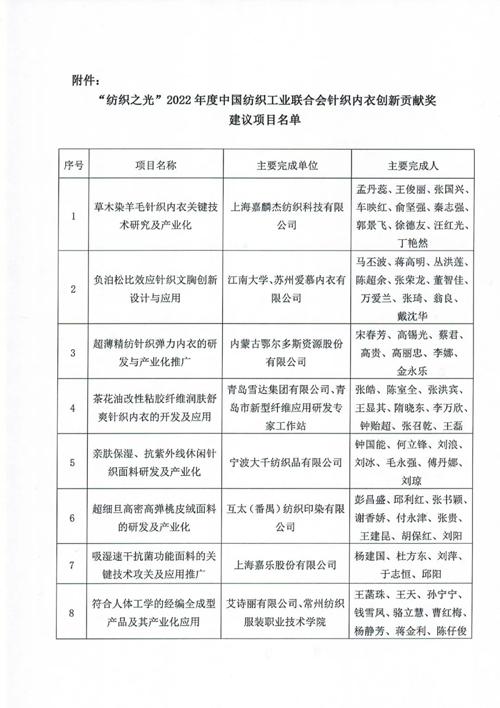 根据《中国纺织工业联合会针织内衣创新贡献奖奖励办法(试行)》和《中国纺织工业联合会针织内衣创新贡献奖奖励办法实施细则(试行)》的规定,经专家组评审,拟授予“草木染羊毛针织内衣关键技术研究及产业化”等9项成果为“纺织之光”2022年度中国纺织工业联合会针织内衣创新贡献奖,现予以公示。
