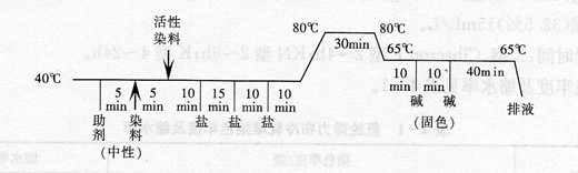 答 活性/分散、活性/中性、活性/酸性、直接/中性、直接/酸性等染料,都可用二浴法、一浴法或一浴二步法染棉/锦织物,从简化工艺和染色牢度诸方面考虑,采用活性/中性一浴二步法为适宜,但要注意一定要选用对锦纶沾染性小的活性染料,才不至于影响色光及染色牢度,如活性黄M 3RE、活性蓝8-RV等对锦纶有严重沾色,应避免使用。棉/锦一浴二步法染色工艺曲线可参考如下: